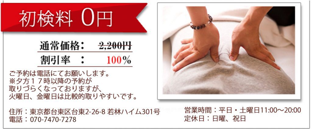 ホームページ特典霜鳥整体院(秋葉原・御徒町・上野)ホームページ限定クーポン 体の歪みからくる肩こりや頭痛、四十肩、胃もたれによる腰痛をカウンセリングから、アフターサポートまで充実した内容で改善!★仕事帰りにも最適です!20:00まで営業中!